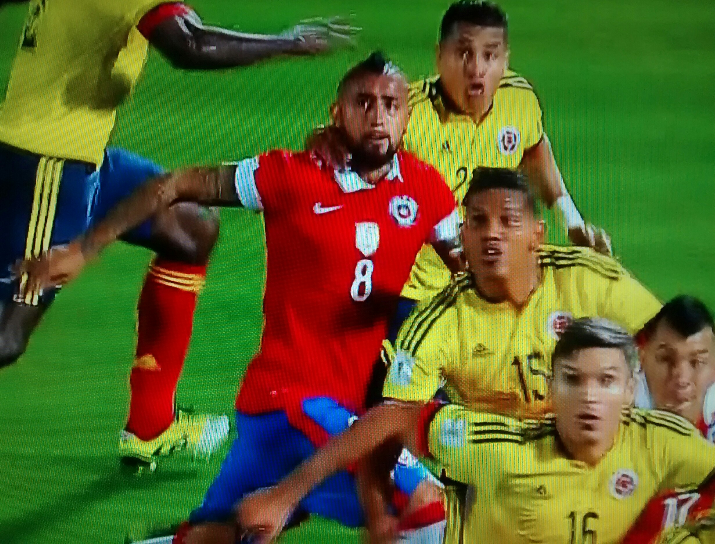 Em Santiago, o Chile fez 1 a 0 no finalzinho do primeiro tempo, com uma forte cabeçada de Vidal, mas cedeu o empate à Colômbia na metade do segundo, num belo giro dentro da área do seu craque James Rodríguez.