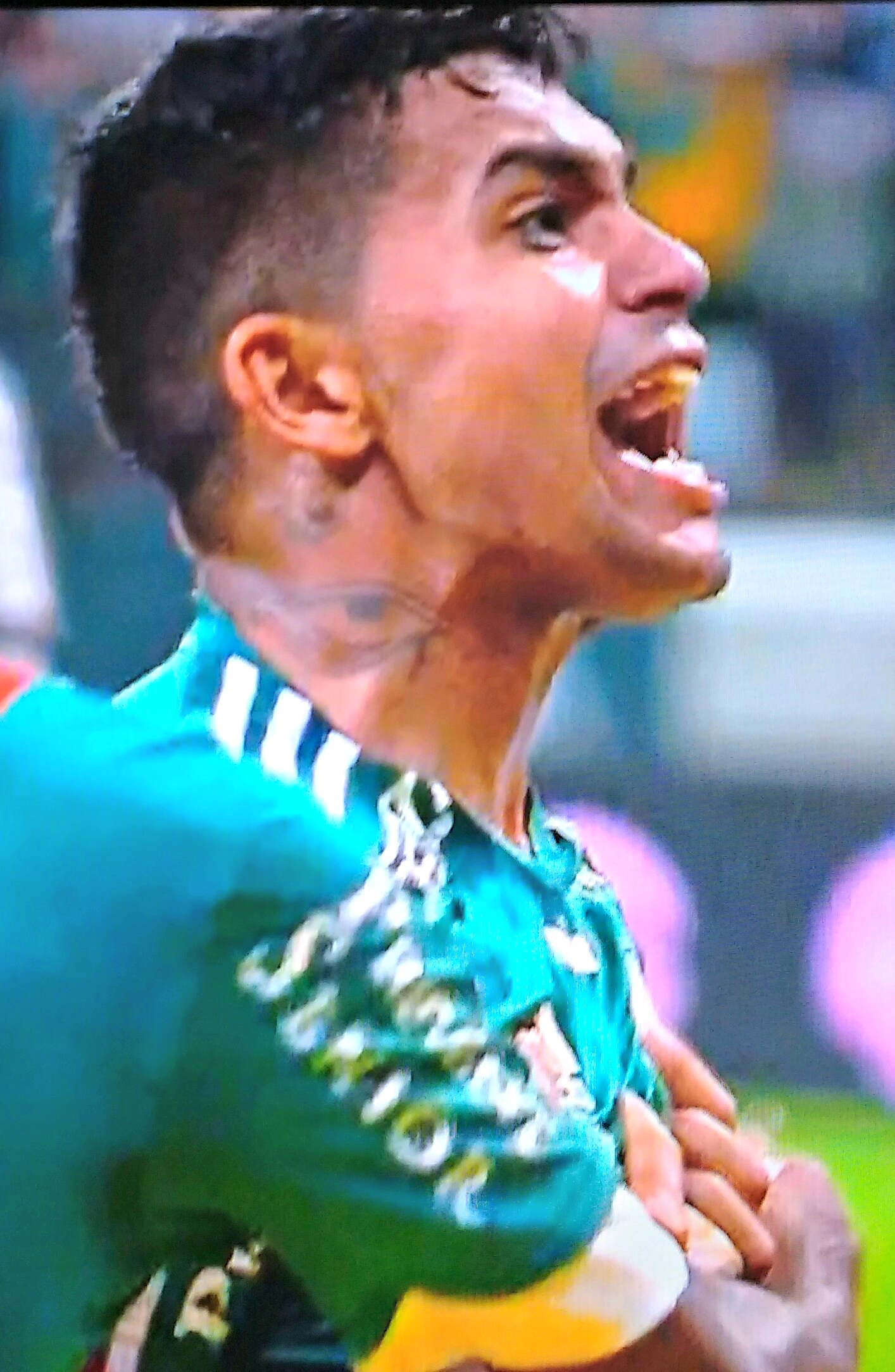DUDU, autor dos gols palmeirenses nos 2 a 1 sobre o Santos que levaram a decisão da Copa do Brasil para os pênaltis, festejando no Allianz Parque a conquista do título
